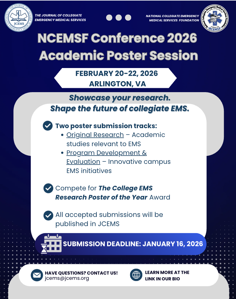 The Academic Poster Session is a joint venture between JCEMS and the National Collegiate EMS Foundation (NCEMSF). Established in 2018 at the 25th Annual NCEMSF Conference, the Academic Poster Session is held annually at the NCEMSF conference. The session provides a forum for collegiate EMS leaders and scholars to share research findings and innovative and novel collegiate EMS programs and initiatives. Presented abstracts and posters are published in JCEMS to promote open access scholarship.