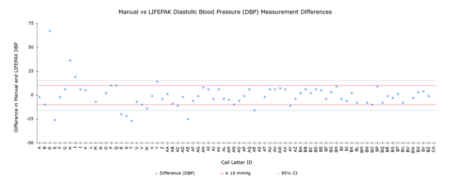 Figure 7. Difference Between Manual and Automatic Diastolic Blood Pressure Measurements per Incident. Data Points are Compared Against the 95% Confidence Interval and the Novel ±10 mmHg Clinical Significance Interval.