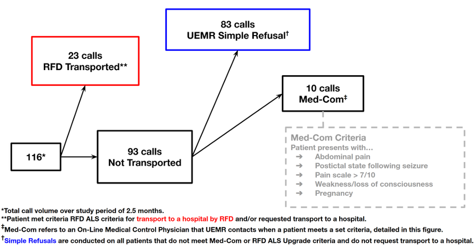 Seventy-nine student volunteers that consented to participation and met the above inclusion criteria were selected at locations around campus that UEMR crews are commonly dispatched to. This was done in an attempt to mirror the true number of non-critical patients and environments that UEMR would be dispatched to throughout the study duration (true call volume from the study duration is outlined in Figure 1).