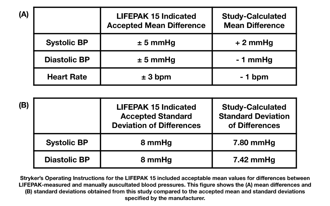 The LIFEPAK 15 Operating Instructions6 provided by Stryker indicate that an acceptable mean difference between non-invasive blood pressure (NIBP) readings and auscultatory readings was ±5 mmHg with a standard deviation of 8 mmHg (corresponding guidelines for differences in automated and manual heart rate measurements was ±3 bpm). Thus, as indicated by the results in Table 2, it was concluded that there was no significant difference between the numerical values obtained using each method. The specific results of the paired t-test are shown in Table 3. These findings provide evidence that manual methods produced measurements comparable to the readings from the LIFEPAK device for these parameters.