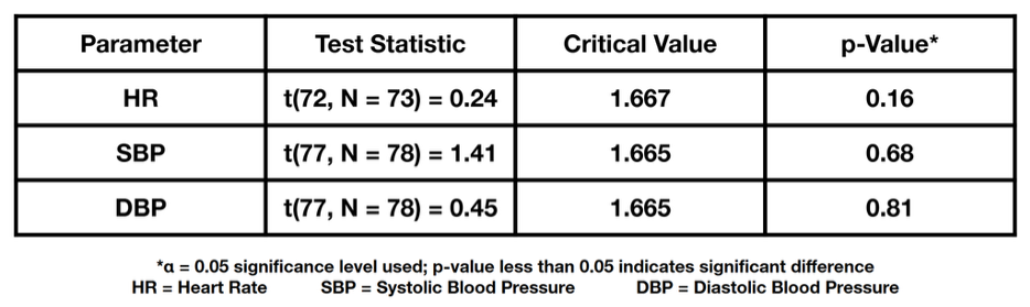 Since these ranges of ±10 mmHg and ±10 bpm also fell within the limits of our calculated 95% confidence intervals, and appeared to be the most restrictive boundaries for what is considered a consistent, these were established as our “boundaries of clinical significance” for differences in blood pressure and heart rate measurements.