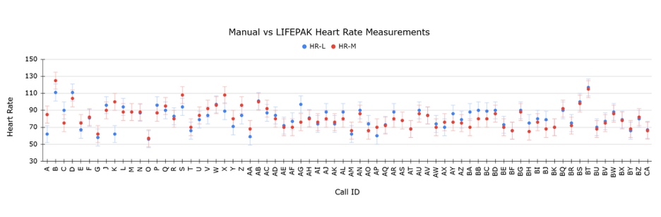Figure 2. Manual (HR-M) and LIFEPAK-Measured (HR-L) Heart Rates per Incident. ±10 bpm is Shown from Each Measurement
