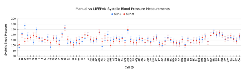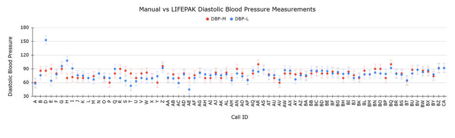 Manual blood pressures were measured with a sphygmomanometer placed on bare skin. Crews alternated manual and LIFEPAK blood pressure measurements on the same arm at five-minute intervals. The measurement process proceeded as follows: crews took the first manual blood pressure measurement, then the first automated measurement five minutes later, and so on. All blood pressures were measured at the brachial artery. These measurements were obtained on consecutive volunteers with verbal consent obtained before each reading. This numerical data was collected and submitted to a Google Form that included a section where crews could note unique environmental conditions, device failures, user errors, and other disturbances or distractions that might have influenced the readings.