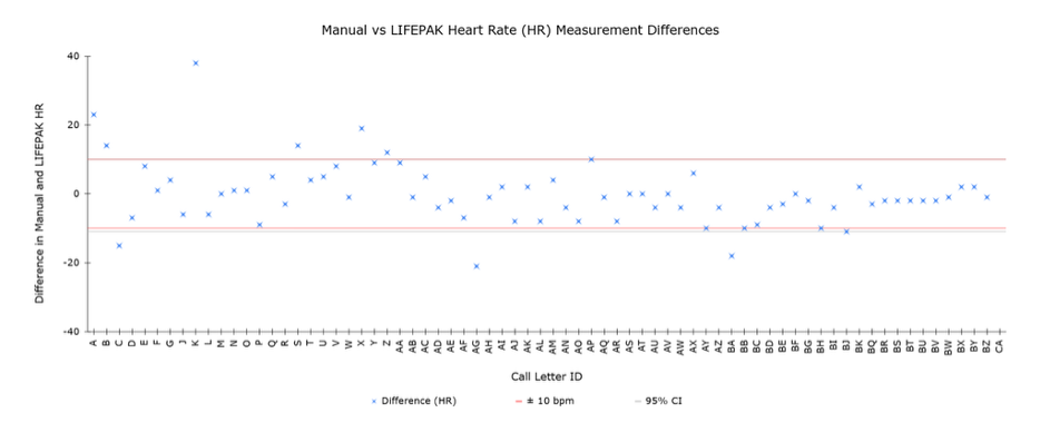 Figure 5. Difference Between Manual and Automatic Heart Rate Measurements per Incident. Data Points are Compared Against the 95% Confidence Interval and the Novel ±10 bpm Clinical Significance Interval.