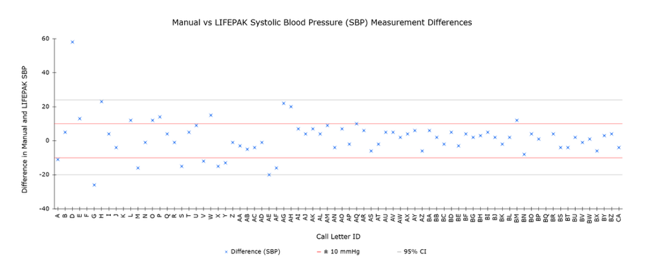 Figure 6. Difference Between Manual and Automatic Systolic Blood Pressure Measurements per Incident. Data Points are Compared Against the 95% Confidence Interval and the Novel ±10 mmHg Clinical Significance Interval.