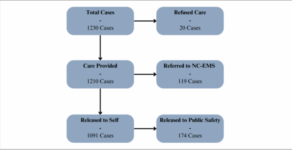 1230 CB-EMS encounters were extracted during the studied timeframe. Figure 1 shows the organization and distribution of cases. Out of 1230 cases that were extracted, 1210 were included in the analysis. 119 (~10%) resulted in a request for NC-EMS support. The remaining 1091 (~90%) did not result in NC-EMS support request and were released to themselves.