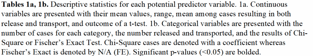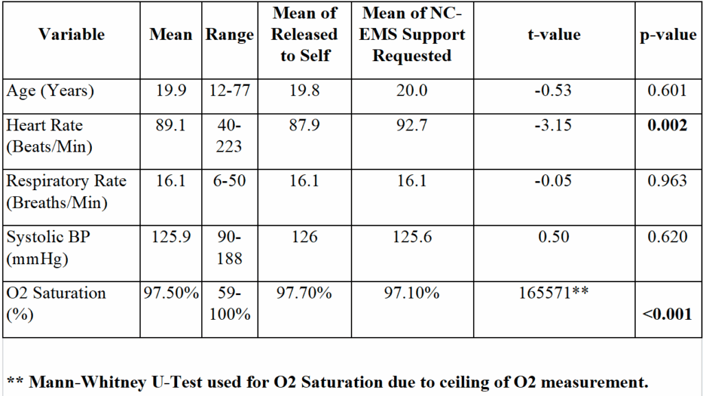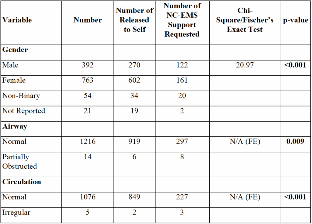All statistical analysis for this project was done using R Studio v. 4.4.1. Prior to model creation, univariate statistics were calculated for each predictive variable, shown in Table 1. Continuous variables were analyzed for mean values, range, means for cases resulting in release to self and those resulting in request for NC-EMS support, and outcome of a t-test for significance. A Mann-Whitney U-test was used to determine significance in O2 saturation due to the ceiling effect of the measurement (100%). Categorical variables were analyzed for the number of cases for each category, the number of those released to self, and those that resulted in requests for NC-EMS support, and the results of the Chi-Square or Fisher’s Exact Test. Chi-Squared was used unless otherwise denoted. Fisher’s Exact Test was used for variables that contained relatively few cases within a class. The data were then analyzed using a logistic regression, which measures the level of association between variables and a binary outcome. For this regression analysis, the binary outcome was released to NC-EMS or released to self. All p-values < 0.05 are considered to be statistically significant.