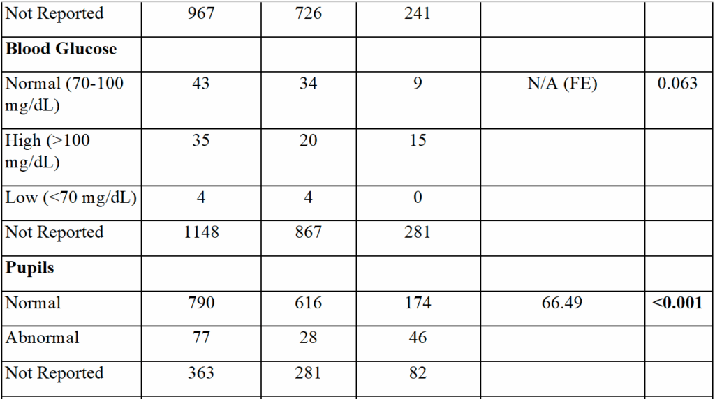 Skin moisture was reported as “normal”, “dry”, or “diaphoretic”. This is a qualitative assessment of the skin. The variable of lung sounds, which is an open-ended response in run reports, was classified as one of three levels: “Clear-Bilaterally”, “Abnormal”, or “Not Reported”. Abnormal lung sounds, which include any kind of abnormal noise reported, unilaterally or bilaterally, were combined due to there being only ten instances of these cases. Each pupil can be charted as PERRL (equal, round, and reactive to light), sluggish, fixed-dilated, fixed-constricted, or unreactive. Due to the size of the sample and the lack of sufficient cases in each of these categories, all patients without PERRL pupils were treated as “abnormal pupils”. Level of consciousness is reported as “Alert”, “Responds to Voice”, “Responds to Pain”, and “Unconscious”.