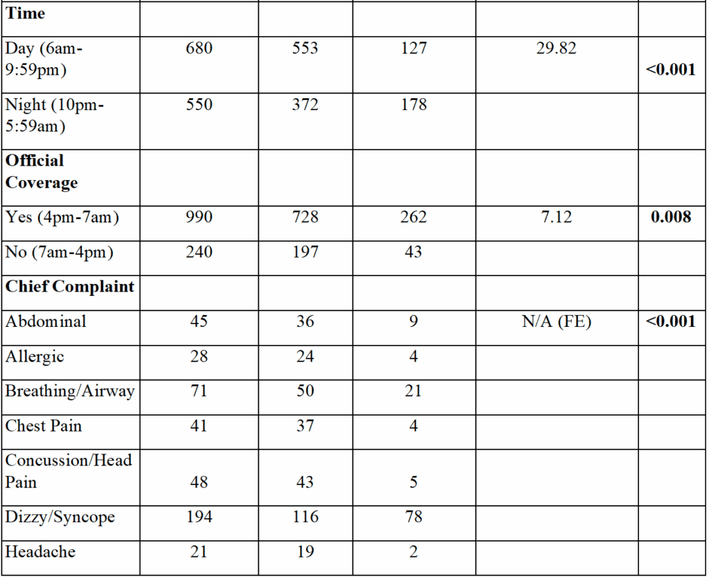 This study used EMS run reports from a small rural college with a non-transporting CB-EMS to identify factors potentially predictive of a request for NC-EMS support. A logistic regression was used to identify those factors that are statistically significant predictors. Requests for municipal NC-EMS are made at the discretion of the responding collegiate EMTs or public safety officers. Public safety officers operate independently but in partnership with the CB-EMS agency. Public safety officers can transport patients following a call, only if they can be released to themselves and require no medical intervention. This service has forty-nine volunteer members, all at the level of EMT. Shifts are assigned on a volunteer basis, with 2 EMTs on duty from 4 pm until 7 am the following day. Some members carry “daytime radios” which allow them to respond to medical calls between 7 am and 4 pm, as they are able. This is known as “unofficial coverage.” Following a medical call, all run reports are submitted to a secure online database for collection and storage. The refusal of service policy is set by the college, which requires a student to be fully aware of the risks of refusal, with no impairment to their orientation.