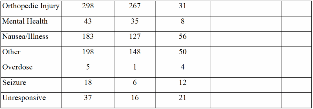 Cases involving male patients were more associated with NC-EMS support requests, compared to female patients, and non-binary patients had an even higher likelihood of NC-EMS support. The gender distribution of this school is 41.4% male and 56.9% female, with 1.7% identifying as non-binary/non-gender-conforming. It is possible that male and non-binary patients presented with more severe symptoms that were not captured by the regression variables. This is always possible for any regression, as a binary model cannot totally capture the nuance of complex cases. However, there is a known trend of implicit biases in healthcare changing the way in which symptoms are reported and perceived across different genders⁵. Women are more likely to experience discrimination in their healthcare and are also more likely to have their symptoms dismissed⁶. Thus, these factors may be influencing female patients’ forthrightness, which may ultimately impact care decisions. It is additionally possible that non-binary patients experience increased support requests because EMTs exhibit more conservative care decisions due to uncertainty or sensitivity around treating patients with diverse gender identities.
