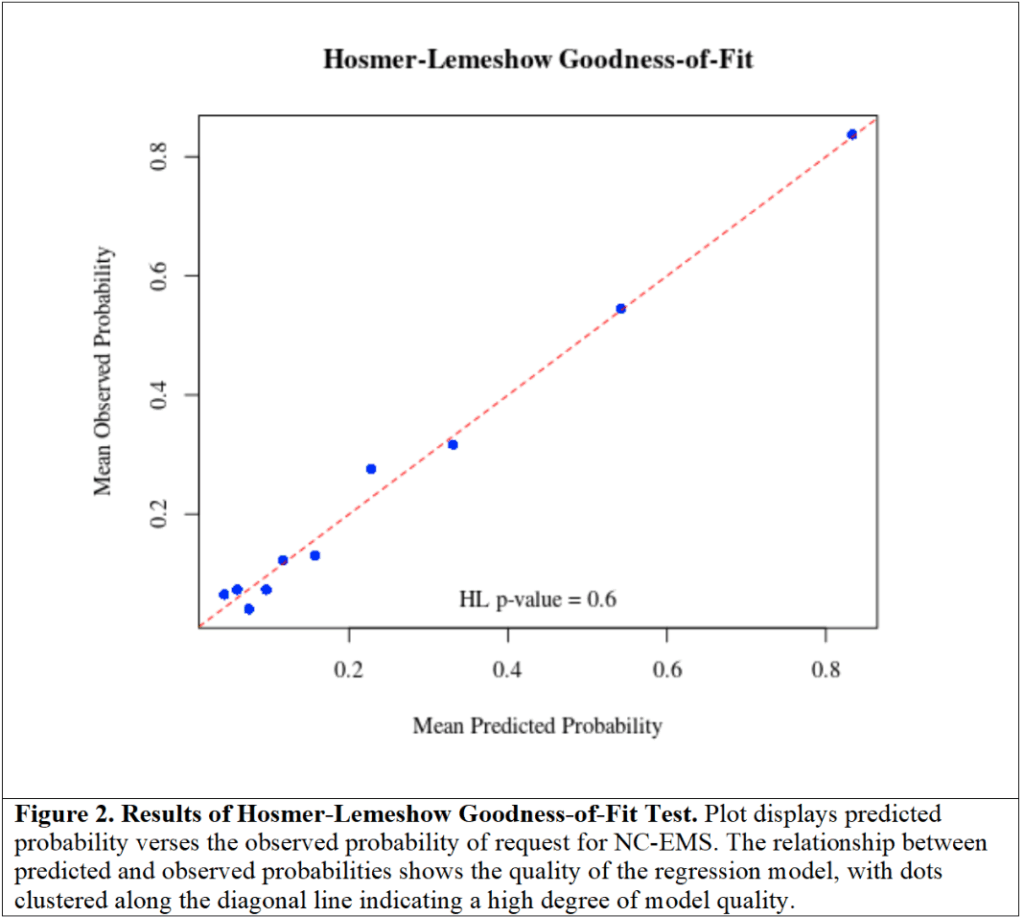 Results of the Hosmer-Lemeshow Test are shown in Figure 2. Points all fall along the diagonal line, which indicate a high-quality model fit (p = 0.6). All methods used to verify model fit and validity indicate that the regression model is significant.