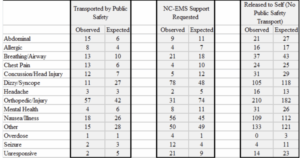 The distribution of chief complaints across patient outcomes was determined, shown in Table 2. Transport by public safety is observed significantly less often for calls reporting the chief complaint of syncope/dizziness, with NC-EMS support being requested for these patients at a higher rate. Abdominal-related calls were transported by public safety at a higher-than-expected rate, however cases involving an illness or nausea were transported less than expected. Orthopedic injuries were overrepresented in the transport by public safety group and released to self group and were underrepresented in request for NC-EMS support group.