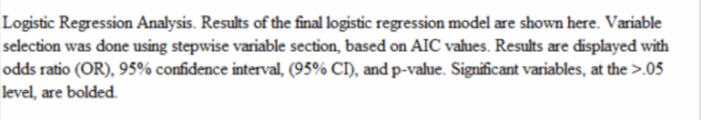 Using the above independent variables, a regression model was created. This initial model contained all possible variables. The model then underwent stepwise variable selection. After stepwise selection, a final model was created. The final model was then measured for its validity and accuracy. Accuracy was assessed using a prediction test that compared outcomes predicted by the model as compared to actual values. Additionally, a McFadden’s pseudo-R-squared (MF R-Squared) test was used, along with a Homer-Lemeshow test to assess model quality.