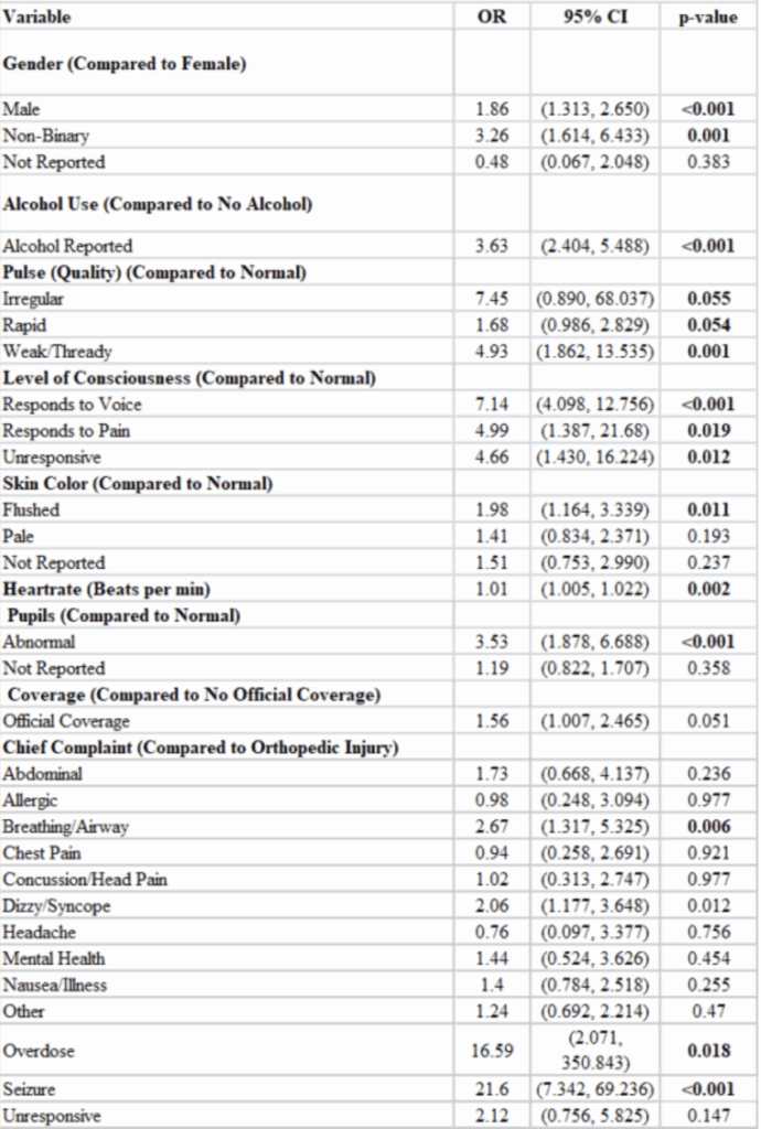 Variables were adjusted to fit the limitations of logistic regression. For instance, allergies were transformed into two categories: no known allergies or allergies reported. This was done for any variable that was not already a categorical one. Independent variables included Age, Gender, Airway Status, Circulation, Level of Consciousness (LOC), Skin Appearance, Skin Moisture, Known Allergy, Alcohol Use, Heart Rate, Respiratory Rate, Systolic Blood Pressure, O2 Saturation, Lung Sounds, Blood Glucose, Pupils, Time of Day, Chief Complaint, and EMS coverage level.