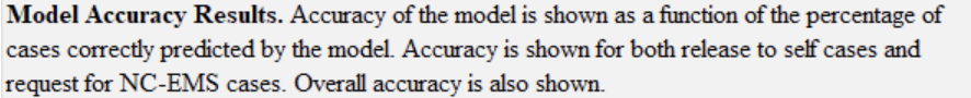 Model accuracy was determined by modeling requests for NC-EMS support decisions using the regression model. These results were then compared to actual outcomes in a confusion matrix. Shown in Table 4, accuracy results show an overall model accuracy of 82.4%. The cut-point for the confusion matrix was set at .35, which is the cut-point that maximized accuracy of the model. The model was more accurate in its prediction of cases that resulted in no support requested from NC-EMS. Additionally, MF R-Squared value was equal to .280, which demonstrates the model is significant at fitting the data.