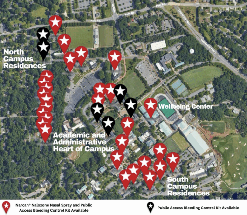 Figure 1. A map of Wake Forest’s campus marking all AED stations that have Narcan® Naloxone Nasal Spray and bleeding control kit housed in them.
