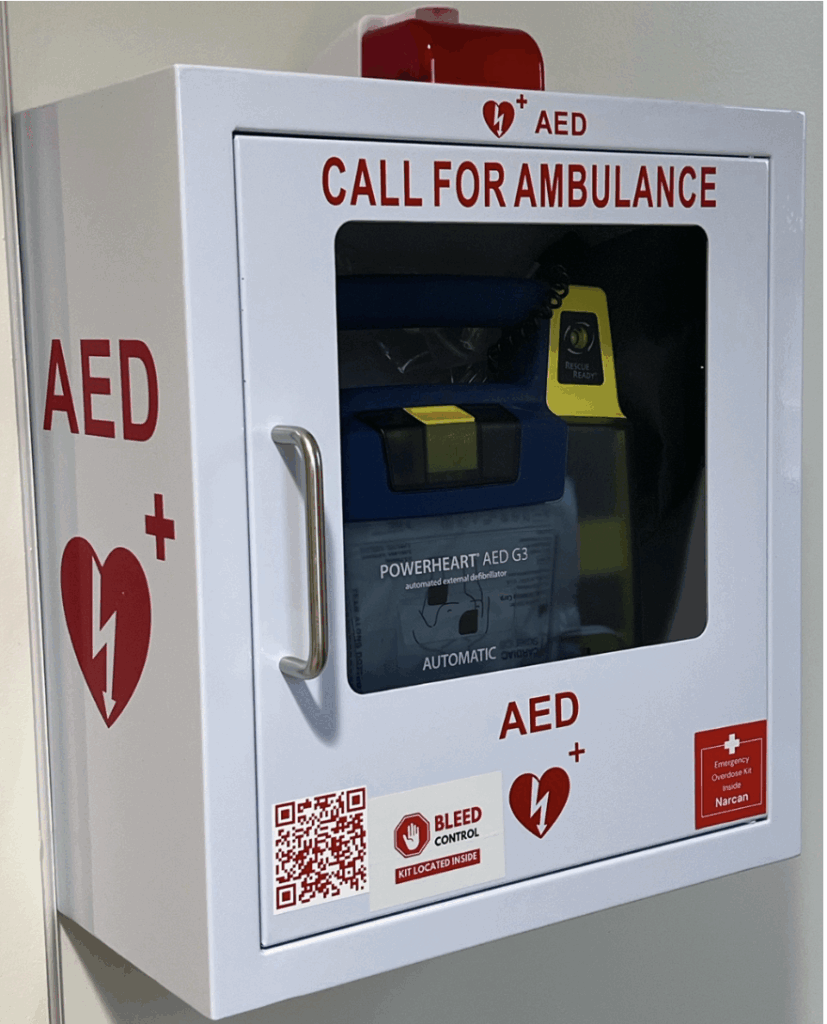 To help ensure public familiarity and awareness of Narcan® Naloxone Nasal Spray and bleeding control (“Stop-the-Bleed”) kits being co-located with the AEDs, stickers were added to the outside of the AED stations. Figure 2 shows a typical AED station with a Narcan® Naloxone Nasal Spray and bleeding control kit setup.